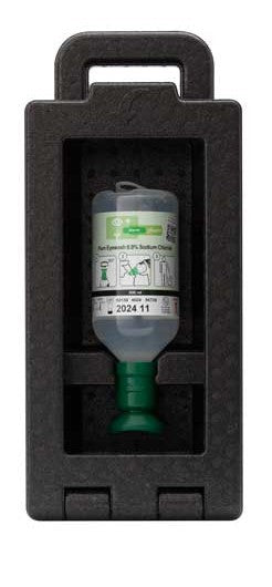 New Design. Economical dustproof station to place throughout the workplace. Comes with (1) 500ml sterile Saline bottle with an eyecup. Bottle has 1/4 turn quick activation. Enclosure has a detachable wall bracket. Solution has a 3 year expiration.